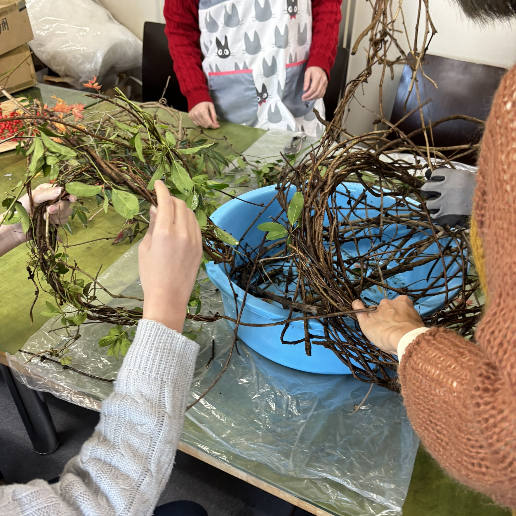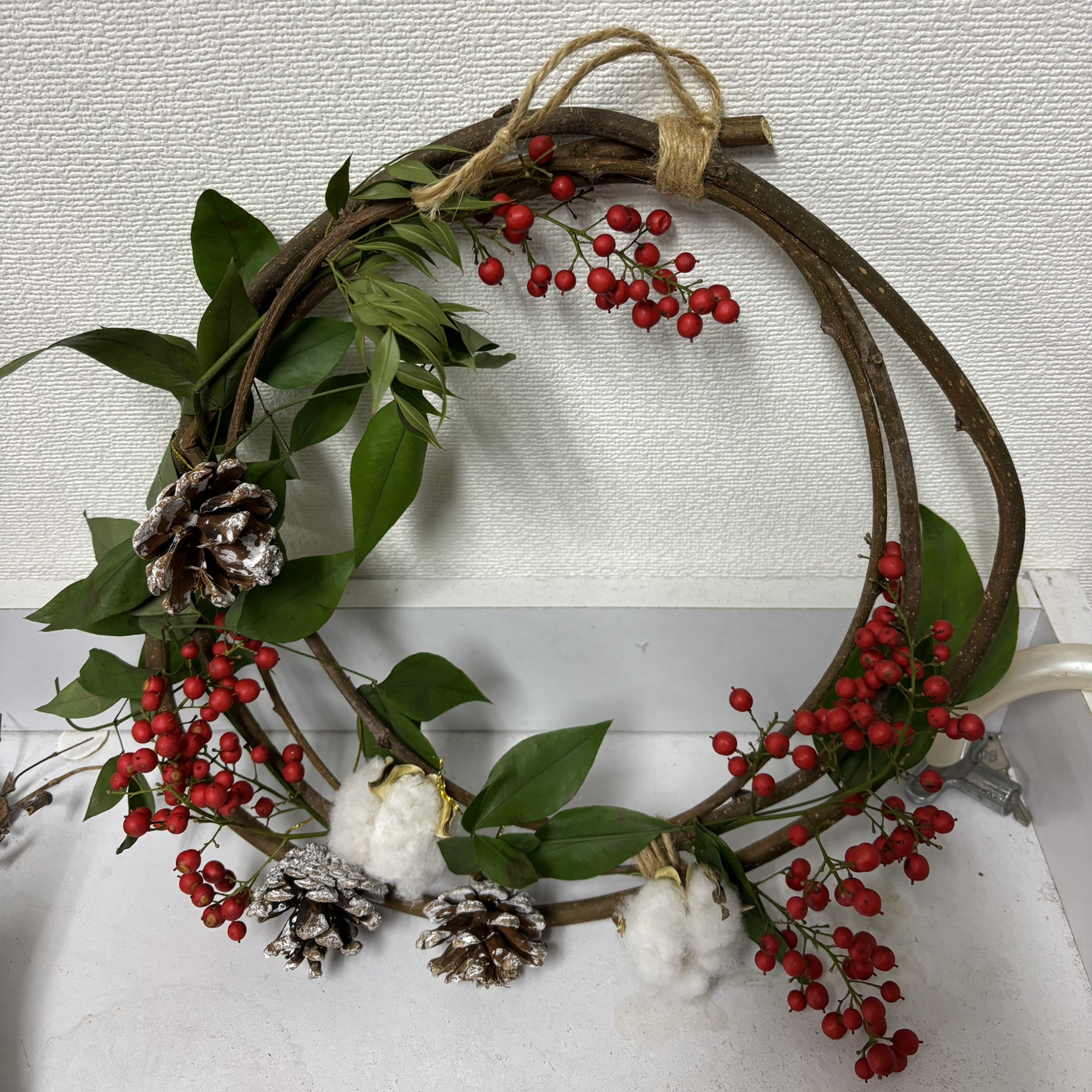 南天の実やいろいろな葉っぱだけではなく、事業所で育てた和綿を活かして作りました。